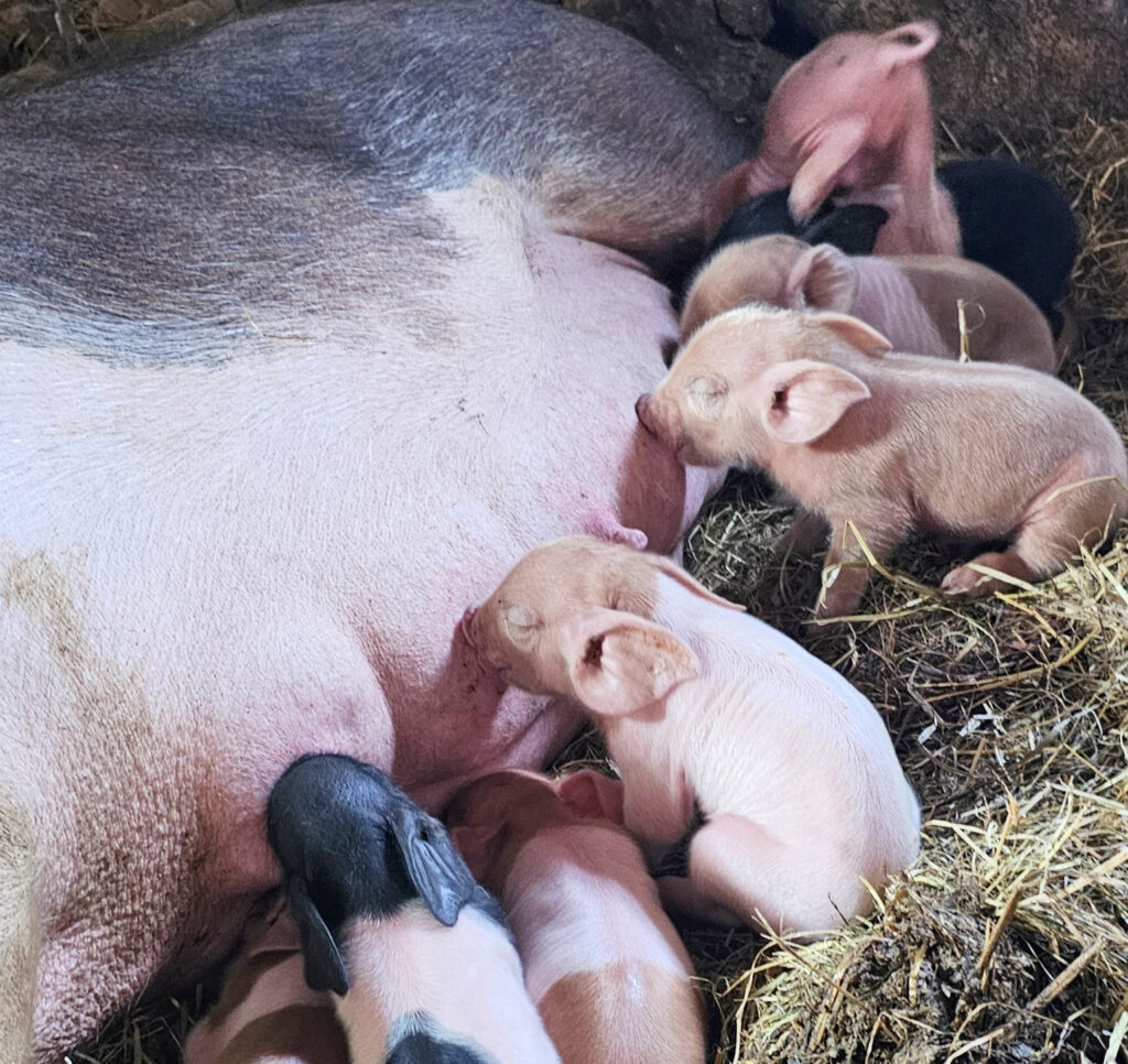• Pastured pigs live lower stress lives in fresh air and sunlight. Like humans, their bodies regulate best with natural daylight and fresh air. Especially when given grass and pasture, pigs live low stress and entertaining lives. Our sows nurse their babies 2-3x the industry standard of just 3-4weeks. Our pigs breed naturally rather than using AI.